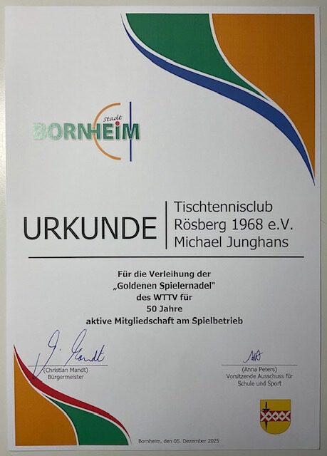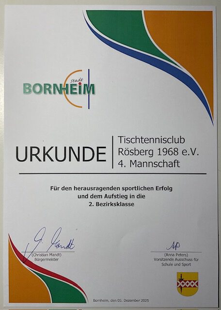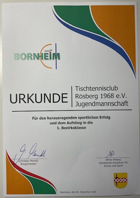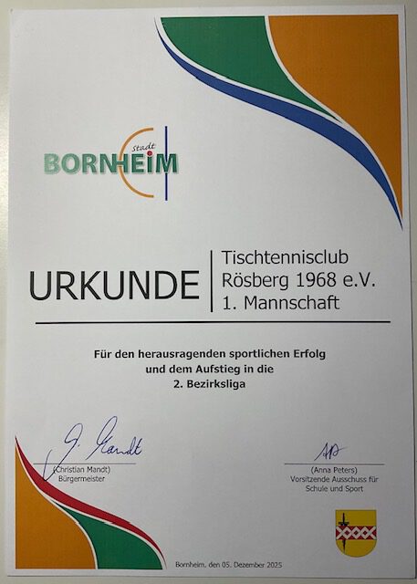 Auch in diesem Jahr wurde der TTC Rösberg für seine Spielerfolge mehrfach geehrt. Bei der Sportlerehrung der Stadt Bornheim am 5. Dezember 2025, die diesmal in der „Oase“ der Europaschule stattfand, verlieh der neue Bürgermeister Christian Mandt dem Verein die stattliche Anzahl von 5 Urkunden: Die 1. und die 4. Mannschaft sowie die Jugendmannschaft wurden für ihren herausragenden Erfolg und ihren teils erneuten Aufstieg ausgezeichnet. Unserem ersten Vorsitzenden Michael Junghans wurden zwei Urkunden für seinen herausragenden 2. Platz bei den TT-Bezirksmeisterschaften des Rhein-Erft-Sieg-Kreises sowie für die Verleihung der „Goldenen Spielernadel“ des Westdeutschen Tischtennisverbandes verliehen. Die feierliche Übergabe der Ehrenurkunden und die ehrenden Worte des Bürgermeisters wurden abgerundet durch einen beeindruckenden Auftritt der Bornheimer Showtanz-Gruppe „Dance for Liberty“.